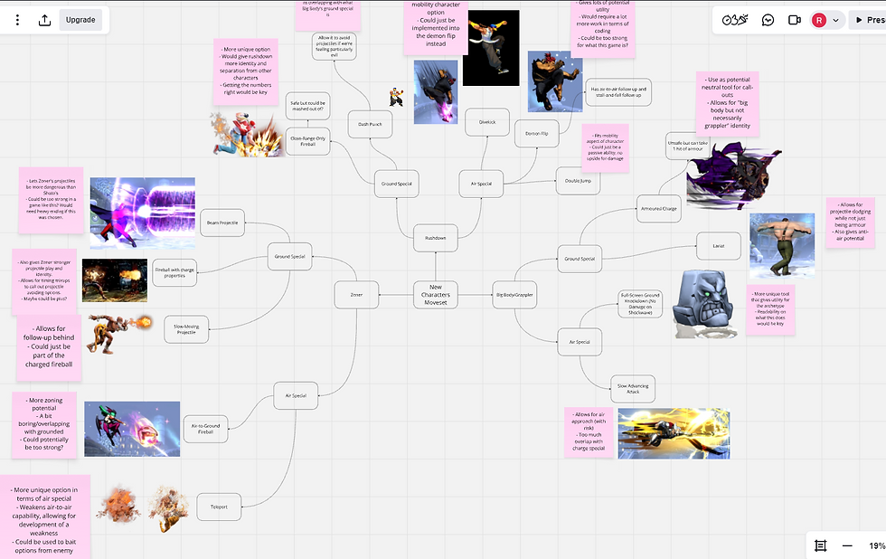 Each character would share universal attributes, such as 8 health chunks, a consistent speed when dashing and a 4 frame jumpsquat, a period where characters in fighting games have a delay before they jump, both for balance and for characters to feel more realistic. But character walk speed, fall speed and jump height all were changed between characters to make each character move and feel different from each other.